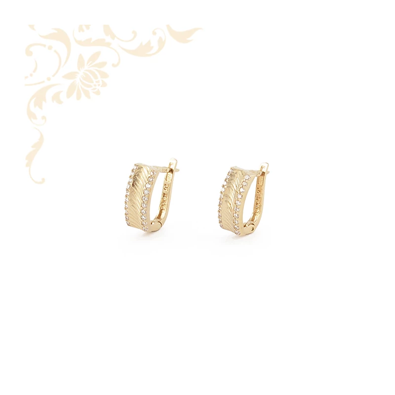 Fehér színű cirkónia kövekkel, gyémántvésett mintával díszített, köves arany fülbevaló, biztonságos francia zárral kapcsolható. Az ékszer 14 karátos sárga aranyból készült. Szép és elegáns viselet. Méret: 13 mm. Súly: 1,99 gr.  |