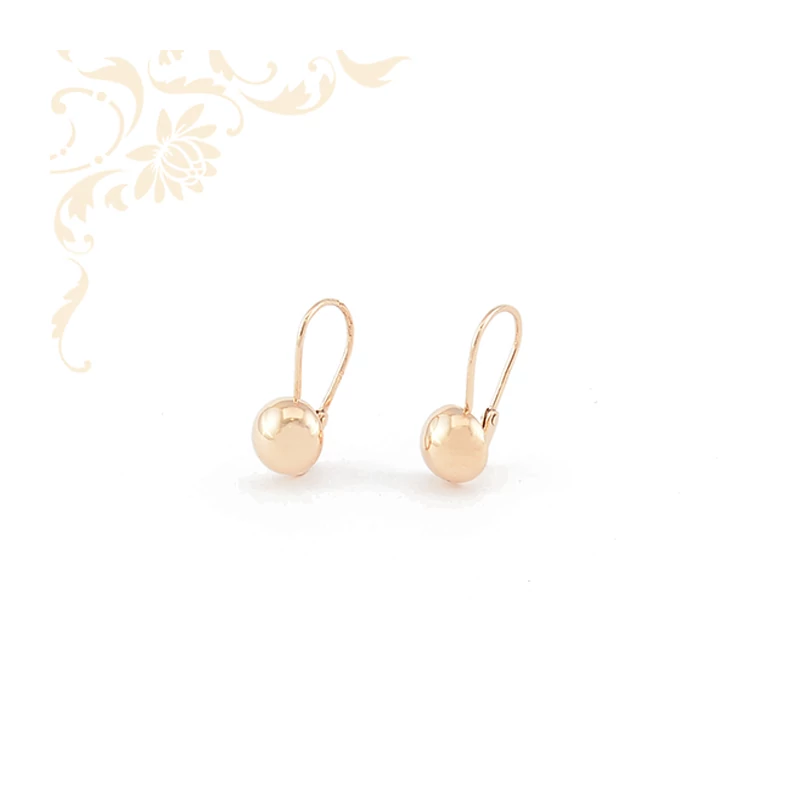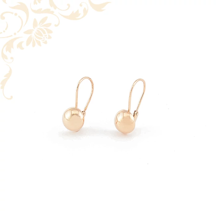 Lencse formájú arany fülbevaló. Az ékszer 14 karátos rozé (vörös) aranyból készült, biztonságos elől kapcsos zárszerkezettel kapcsolható. Méret: 18 mm. Súly: 1,35 gr.