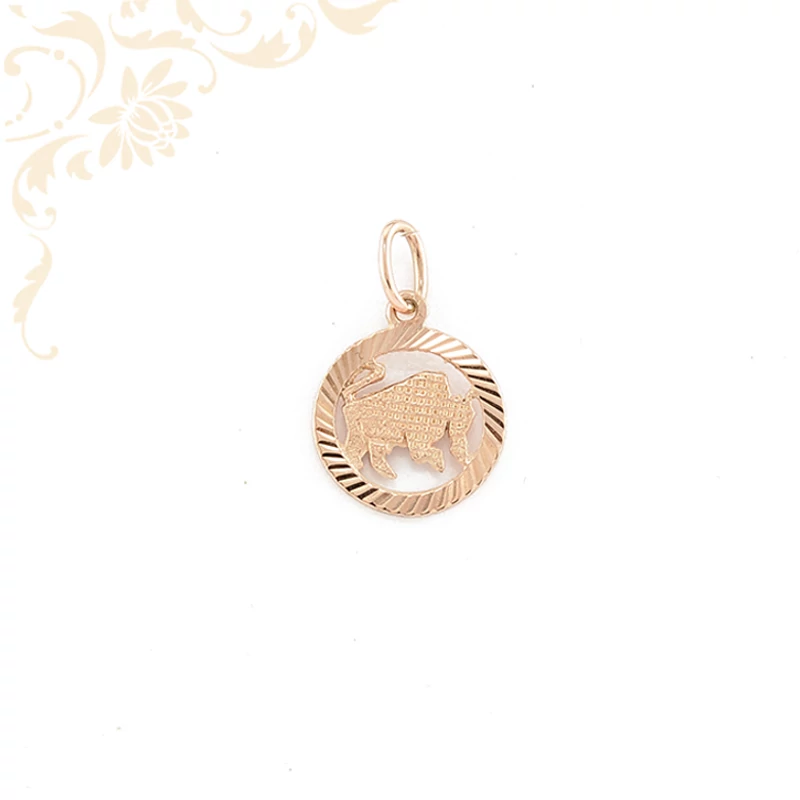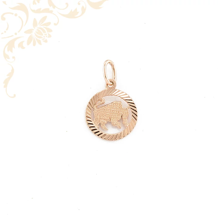 Kör alakú, áttört, gyémántvésett mintával díszített horoszkópos arany medál, melynek közepét bika zodiákus jegy díszíti. Az ékszer 14 karátos rozé aranyból készült.