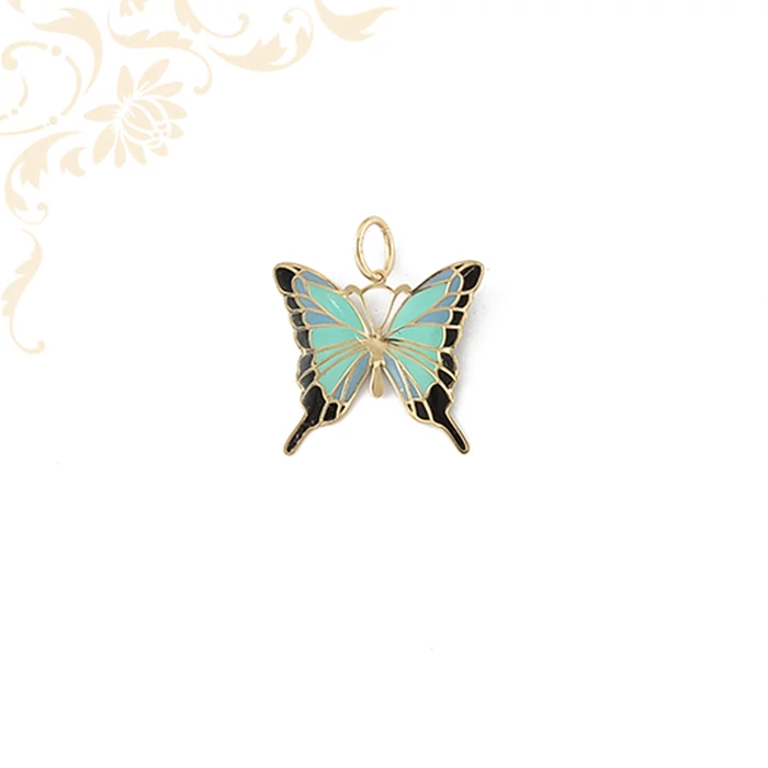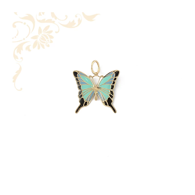 Kis súlyú, mindkét oldalán színes lakkfestéssel díszített arany pillangó medál. Az ékszer 14 karátos sárga aranyból készült. Nagyon szép viselet. Méret: 20 mm. Súly: 0,51 gr. |
