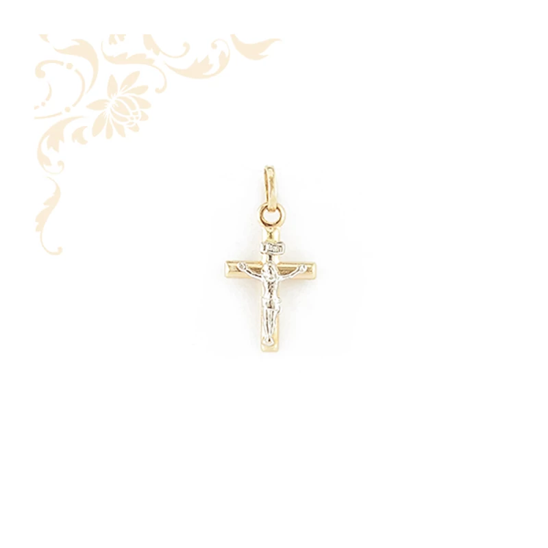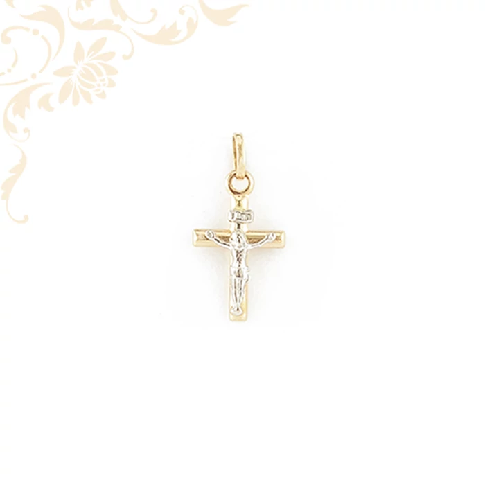 Kis súlyú, kereszt arany medál, ródium bevonattal díszítve. Az ékszer 14 karátos sárga aranyból készült. Méret: 20 mm. Súly: 0,83 gr. |