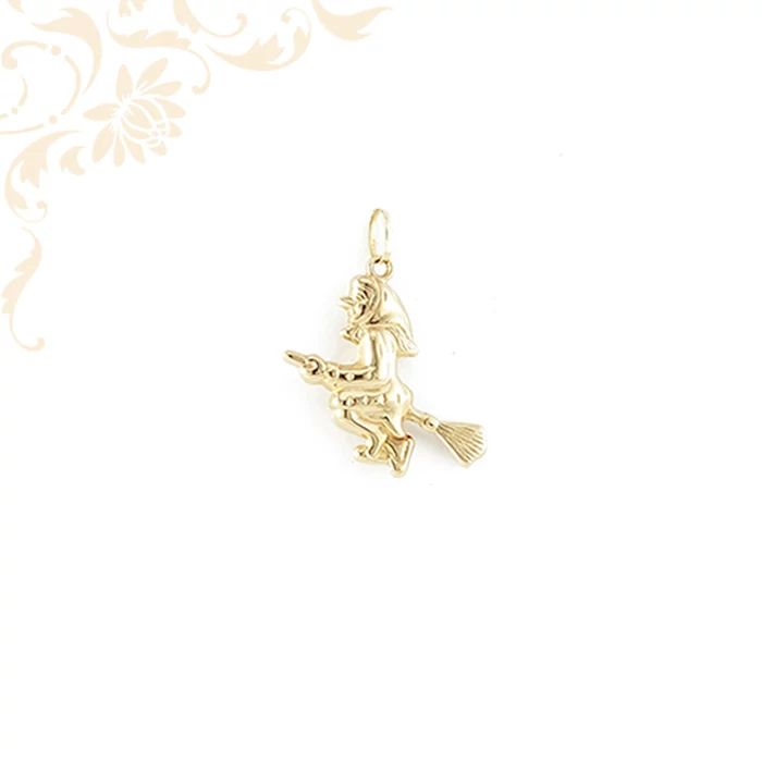 Boszi, Boszorkány seprűnyélen arany medál (3D). Az ékszer 14 karátos sárga aranyból készült. Vicces és ötletes ajándék is lehet. Méret: 20 mm. Súly: 0,69 gr. |