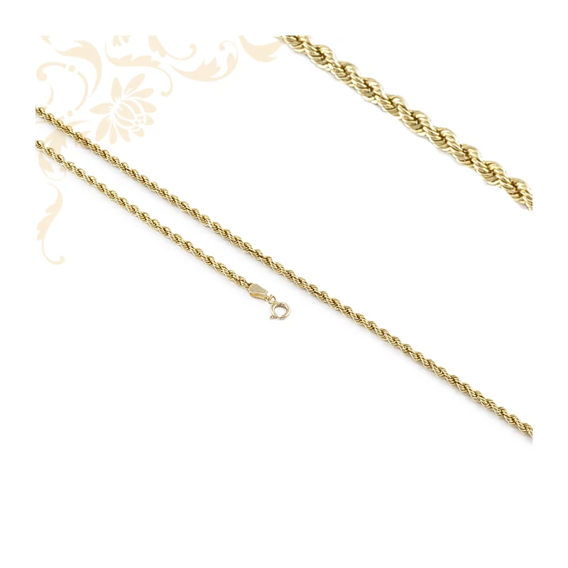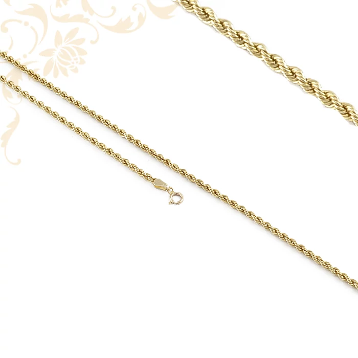 Időtlen fonott elegancia – 14 karátos arany nyaklánc Ez a 14 karátos arany nyaklánc a Walles fonás klasszikus szépségét idézi meg – sűrű, spirálisan fonott láncszemei egyszerre sugároznak erőt és finomságot. A fény játékosan siklik végig a sodrott felületen, életre keltve az arany mély, meleg ragyogását. A sodrott kialakítás miatt a lánc felülete nem sima, hanem számos apró, ferde felületből áll. Ez a textúra teszi lehetővé, hogy a lánc a legapróbb mozgásra is folyamatosan csillogjon és ragyogjon, egy aranyló kötélszál illúzióját keltve. Tökéletes választás mindennapi viseletre vagy különleges alkalmakra: a tartós, mégis elegáns megjelenés garantáltan örök darabbá teszi. Mint egy aranyló fonál, amely összeköti a múlt hagyományait a jelen eleganciájával. Méret: 45 cm Súly: 2,33 gr |