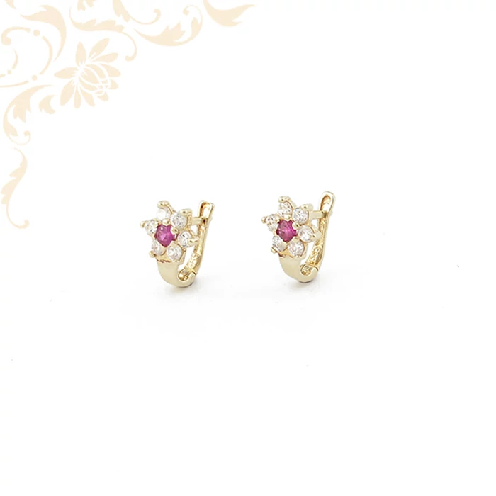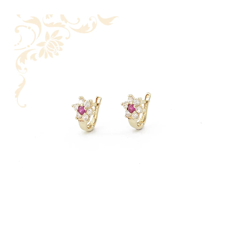 Virág formájú köves gyermek arany fülbevaló, fehér színű cirkónia kövekkel és mályva színű szintetikus kővel ékesítve. Az ékszer 14 karátos sárga aranyból készült, biztonságos francia zárral kapcsolható. Nagyon szép viselet. Méret: 10 mm. Súly: 2,00 gr. |