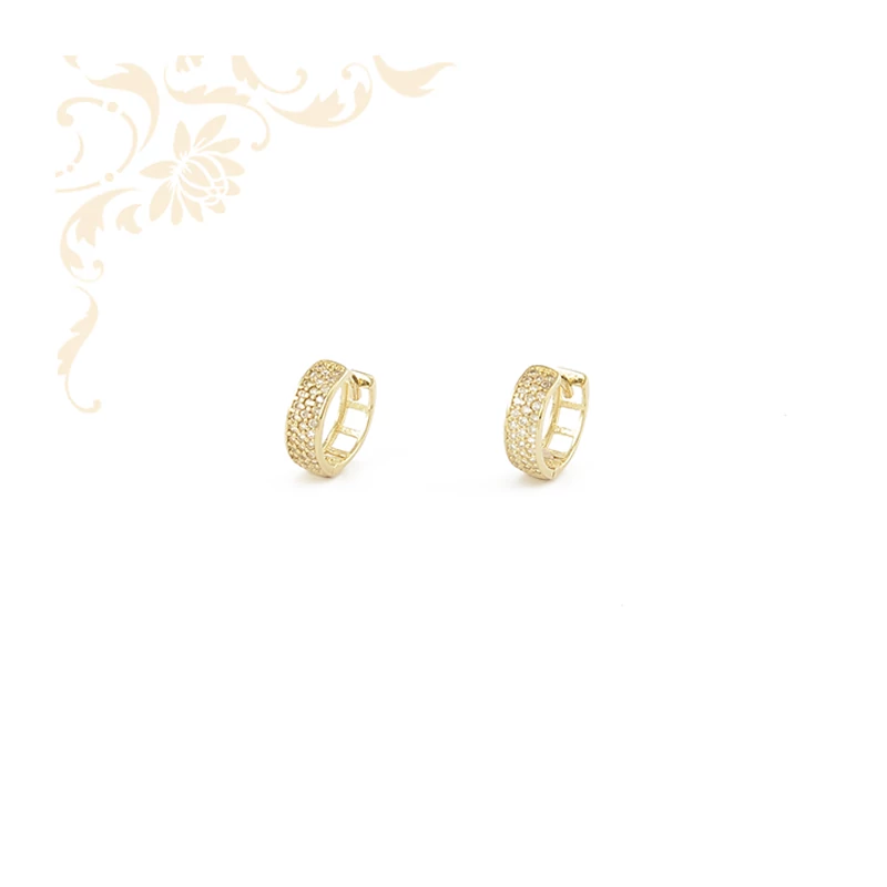 Fehér színű cirkónia kövekkel ékesített, gyermek arany karika fülbevaló, bepattintós zárszerkezettel kapcsolható. A fülbevaló hátsó része áttört mintás. Az ékszer 14 karátos sárga aranyból készült. Átmérő: 10 mm. Súly: 1,61 gr. szélessége: 4 mm. |