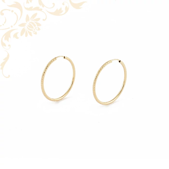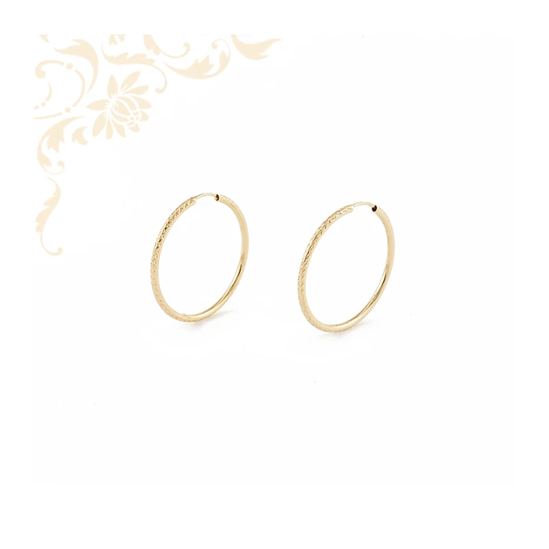 | Nagyméretű, üreges női arany karika fülbevaló, gyémántvésett mintával díszítve. Az ékszer 14 karátos sárga aranyból készült, önmagában záródó zárszerkezettel kapcsolható. Nagyon mutatós viselet. Átmérő: 35 mm. Súly: 2,45 gr. | |