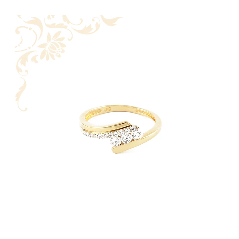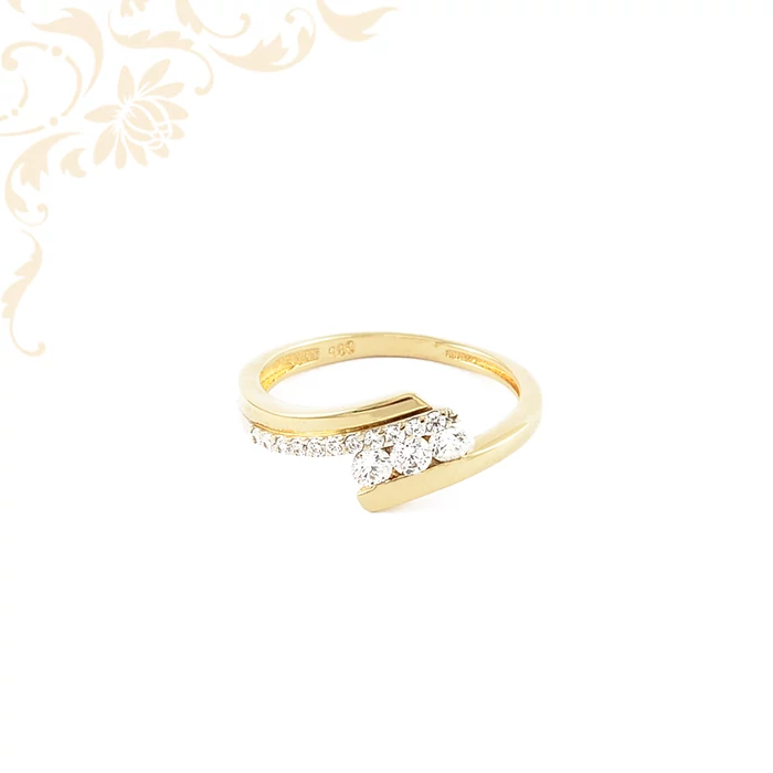 Elegáns 14 karátos arany gyűrű cirkónia kövekkel – modern minimalizmus finom részletekkel Ez a 14 karátos sárga arany gyűrű tökéletes egyensúlyt teremt a letisztultság és a finom csillogás között. A gyűrű vonalvezetése enyhén ívelt, kecses formáját pedig egy sor apró, ragyogó cirkónia kő díszíti. A középpontban három nagyobb cirkónia kő is helyet kapott, melyek különleges karaktert kölcsönöznek az ékszernek. A dizájn visszafogottan modern: az aszimmetrikus záródás és az arany sávok közötti játékos dinamika egyedivé teszi az arany gyűrű megjelenését. Egy modern eleganciát képviselő darab, amely finoman hangsúlyozza viselője stílusát és nőiességét. Főbb jellemzők: Ez az arany gyűrű egy különleges, mégis könnyed kiegészítő, amely diszkrét módon emeli ki a kezed szépségét – a letisztult elegancia kedvelőinek tökéletes választás. Méret: 55 Súly: 2,46 gr |