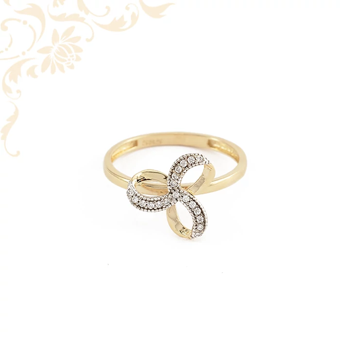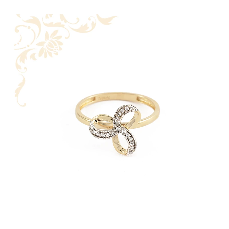 | Igazán különleges fazonú, egyedi megjelenésű, fehér színű cirkónia kövekkel ékesített, női köves arany gyűrű. Az ékszer 14 karátos sárga aranyból készült. Méret: 57. Súly: 1,67 gr. | |