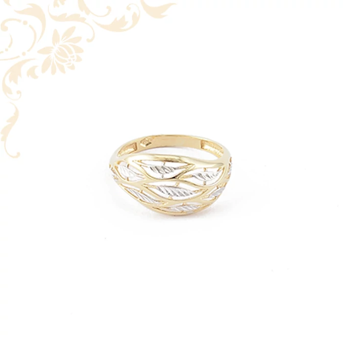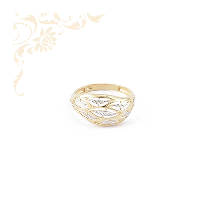 Áttört fejrészű, ízléses gyémántvésett mintával, ródium bevonattal díszített, női arany gyűrű. Az ékszer 14 karátos sárga aranyból készült. Kis súlya ellenére igen mutatós viselet. Méret: 55. Súly: 1,67 gr. |