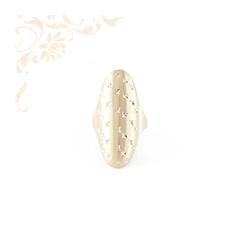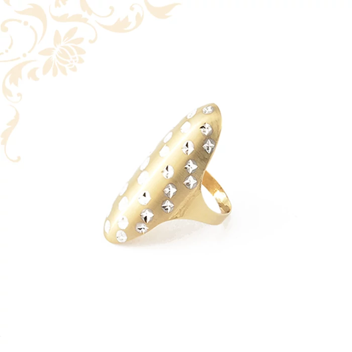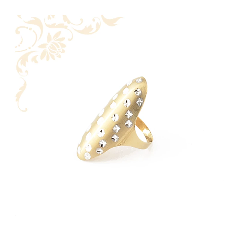 Exkluzív megjelenésű női arany gyűrű, gyémántvésett mintával, ródium bevonattal díszítve. Az ékszer 14 karátos sárga aranyból készült. Extra darabok kedvelőinek kitűnő ajándék! Az ékszerről 2 db termékfotó készült. Méret: 61. Súly: 3,68 gr. A gyűrű fejrészének hossza: 38 mm. |