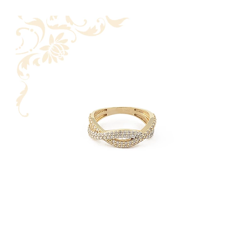 Áttört fejrészű, hullámos vonalvezetésű női köves arany gyűrű, fehér színű cirkónia kövekkel ékesítve. Az ékszer 14 karátos sárga aranyból készült. Nagyon elegáns viselet. Méret: 53. Súly: 2,57 gr. |