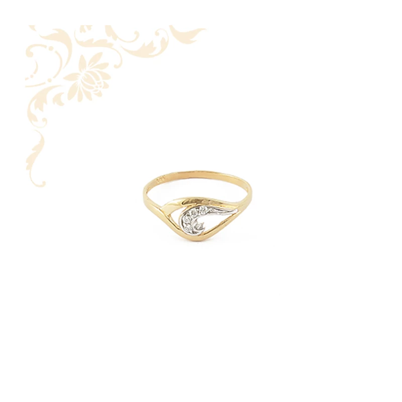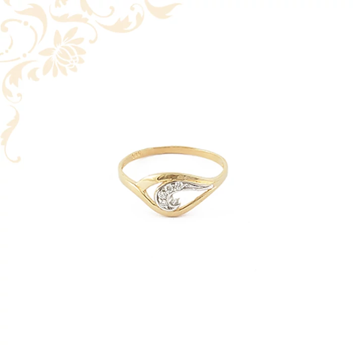 Kis súlyú, áttört fejrészű női köves arany gyűrű, fehér színű cirkónia kövekkel és ródium bevonattal díszítve. Az ékszer 14 karátos sárga aranyból készült. Nagyon elegáns viselet. Méret: 57. Súly: 1,31 gr. |