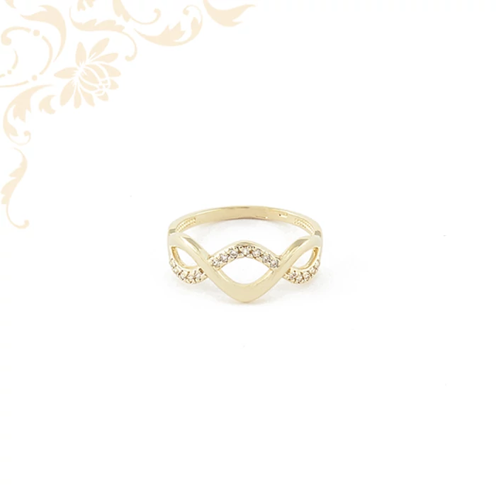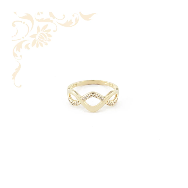 Áttört fejrészű, hullámos vonalvezetésű női köves arany gyűrű, fehér cirkónia kövekkel ékesítve. Az ékszer 14 karátos sárga aranyból készült. Nagyon elegáns viselet. Méret: 50. Súly: 1,52 gr. |